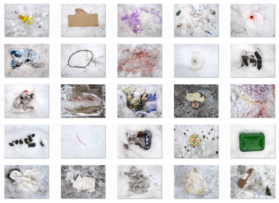 Damals begann ich auf meinen Wegen Dinge, die auf dem Schnee liegen geblieben waren, und Spuren des Berliner Stadtlebens zu fotografieren. Manches war am nächsten Tag verschwunden, anderes schichtete sich nach und nach ein. Manche Fundstücke warfen Fragen auf: Wie gelangt eine Pfanne mit Fettresten an eine Tramstation? So befand ich mich im Sog des Sehens von Zeichen und Formen, die Rätsel aufgaben und Geschichten entstehen ließen.